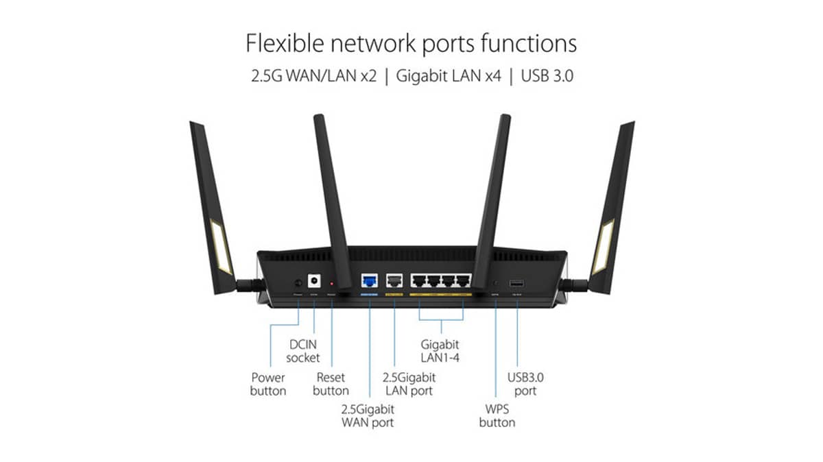 راوتر RT-AX88U برو AX6000 ثنائي النطاق واي فاي 6 من اسوس| منفذ مزدوج 2.5G| وCPU رباعي النواة 2.0GHz| ايه اي بروتكشن برو| WPA3| رقابة ابوية| دعم واي فاي شبكي| نظام جودة خدمة تكيفي| توجيه المنفذ| أسود